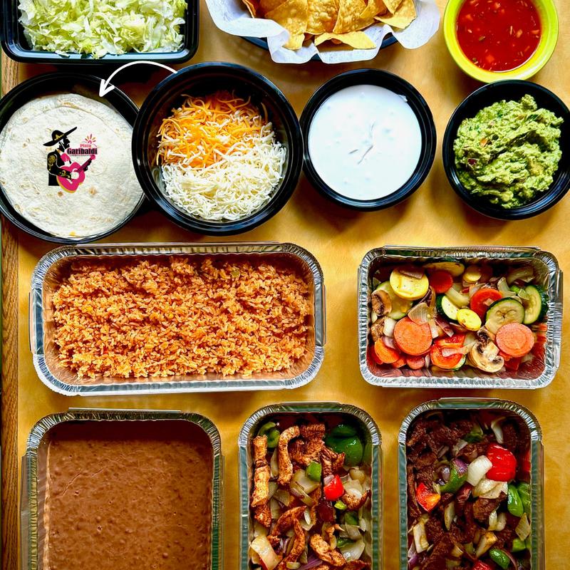$19.95/per person • Strips of Chicken Breast or Steak sauteed with onions, bell peppers, and mushrooms. Make your own tacos style. Served with all you need to have a delicious meal • Choice from: Chicken Carnitas | Steak Carnitas | Veggie Fajitas (Zucchini, Carrots, Mushrooms, Onions, Bell peppers) | Mexican Rice | Refried Beans (or whole pinto beans) | Shredded cheese | Lettuce | Flour and corn tortillas 2 per person | Sour Cream | Guacamole | Chips | Salsa